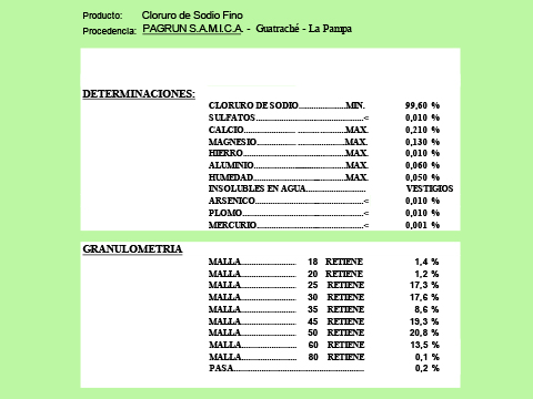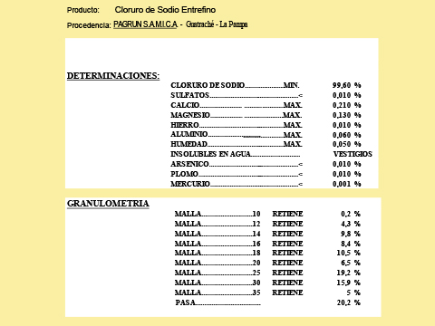 EL CLORURO DE SODIO La sal (Cloruro de Sodio) se extrae de un yacimiento, que posee una capa madre de dicho mineral debajo del lecho de las lagunas denominadas Salinas. El proceso de obtención de sal en las lagunas, se origina por una etapa de disolución de la capa madre con el ingreso de aguas dulces por precipitaciones, las que disuelven parte de la veta de Cloruro de Sodio formando una salmuera concentrada de 6 a 7 veces más que el agua de mar. En las estaciones cálidas se produce la evaporación por efectos de los rayos solares, comienza a precipitar y se forman los granos de Sal sobre el lecho de las Lagunas. Cuando se ha formado una suficiente capa de Sal, de tal manera que sin romperla, puedan pisar los equipos de extracción (Tractores, Camiones, Cosechadoras, etc.) evitando con esto que tierra o arena del fondo de las Lagunas se mezcle con los granos de sal. Se raspa la parte superior y se cosecha con los equipos adecuados, acopiándola en grandes parvas sobre las playas preparadas. Luego de un período adecuado de estacionamiento, la sal estará en condiciones de ingresar al proceso productivo, que mediante un refinamiento la convertirá en sal apta para uso industrial o consumo animal. La sal requiere de un proceso que asegure la ausencia de cualquier contaminante, y por tal razón es lavada con salmuera saturada en sucesivas etapas, eliminando de esta manera las sales acompañantes, las pequeñas partículas adheridas en las caras de los cristales y los cuerpos más pesados o más livianos que el Cloruro de Sodio. Luego es centrifugada para separar el grano limpio del líquido que arrastra las impurezas. En la siguiente etapa, la sal es sometida a un secado que asegura la eliminación de microorganismos adheridos u ocluídos en los cristales, como las bacterias halófilas. La Sal, ya seca y en condiciones adecuadas para ser calificada por diferentes tamaños de cristales, pasa a través de un tándem de zarandas, las que la separan en 2 tamaños de cristales: entrefino y fino con los cuales la Sal sale al mercado para su uso, para consumo animal o Industrial.